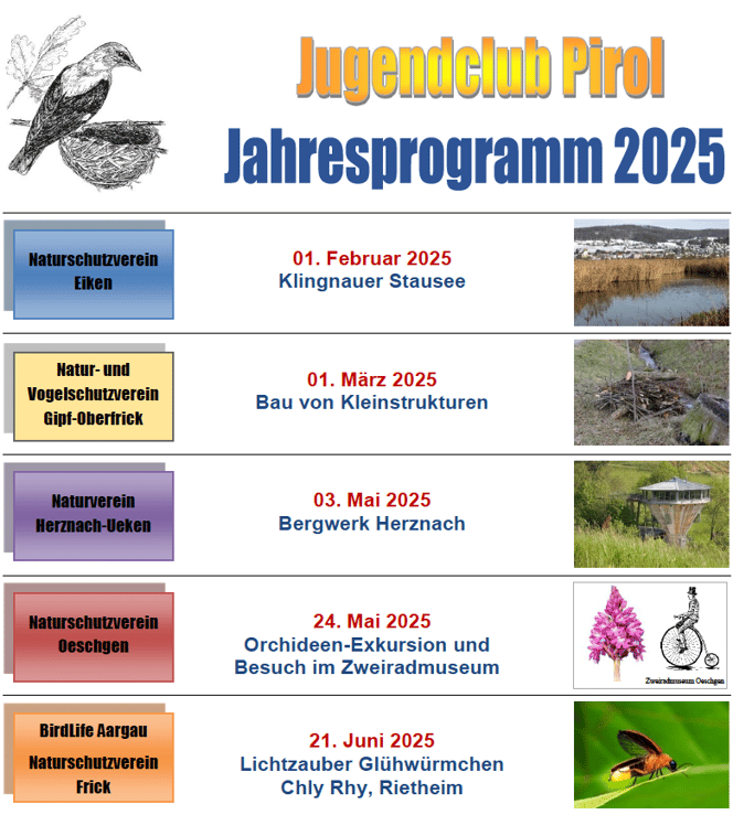 Die Natur- und Vogelschutzvereine der Region Frick sind gemeinsam Träger des Jugendclubs "Pirol". Alle sieben Vereine (Eiken, Frick, Gipf-Oberfrick, Herznach-Ueken, Oeschgen, Wittnau und